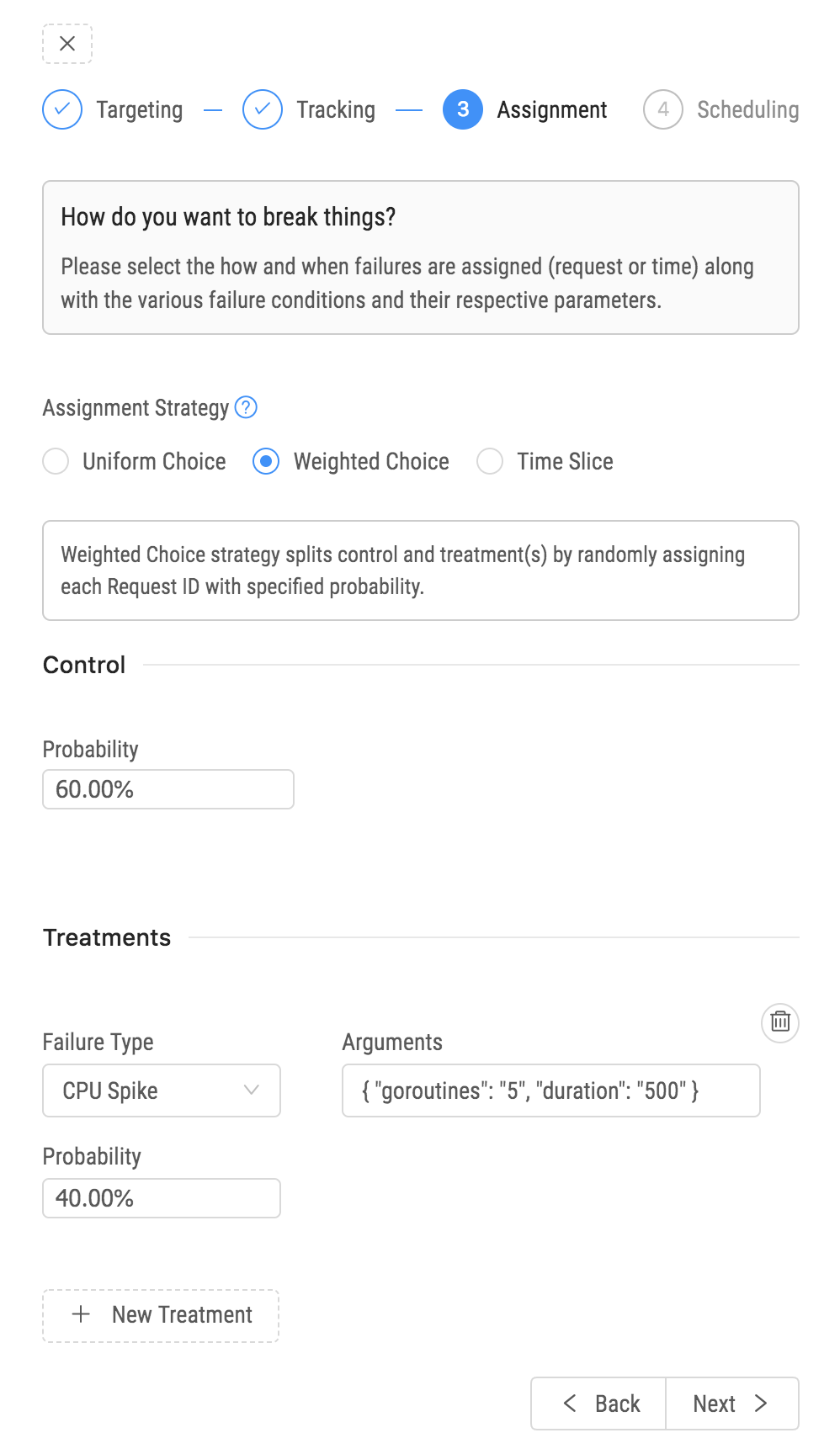 Next, we provide a UI to specify a strategy for dividing control and treatment groups, failure types, and configurations for each treatment. For the final step, provide a time duration and create the experiment. You’ve now added a chaos failure to your system and can monitor how it affects system behavior.