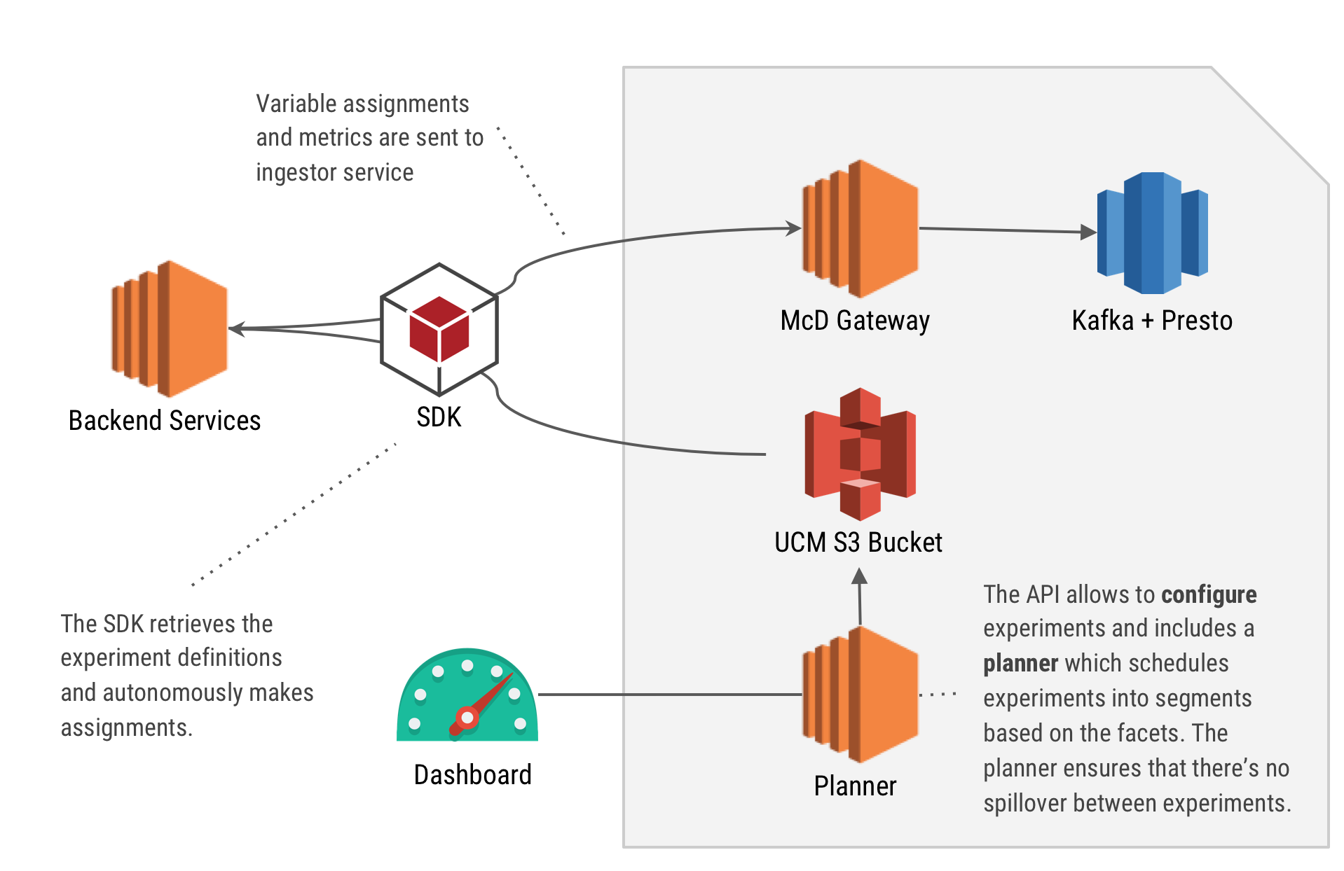 Our SDK uses an internal configuration service to store configurations (the Universal Configuration Manager, or UCM, which uses Amazon S3 behind-the-scenes). All of our backend services poll from UCM and get notified when a configuration is updated. The figure below demonstrates the overall system architecture.