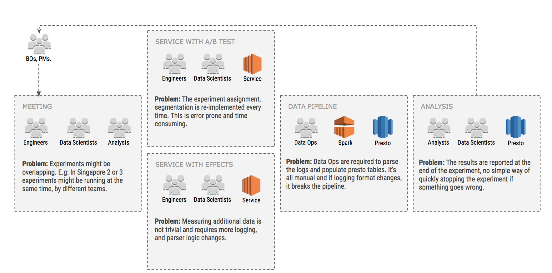 Before 2017, all our experiments were done manually with custom code written here and there in every backend service. As our engineering team grew, this became unsustainable and resulted in excessive friction and endless meetings. The figure below describes problems we used to face before having a centralised experimentation platform. This was an iterative process which sometimes took weeks, slowing down the organisation altogether.
