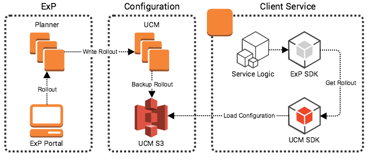 Our SDK uses an internal configuration service to store configurations (the Universal Configuration Manager, or UCM, which uses Amazon S3 behind-the-scenes). All of our backend services poll from UCM and get notified when a configuration is updated. The figure below demonstrates the overall system architecture.