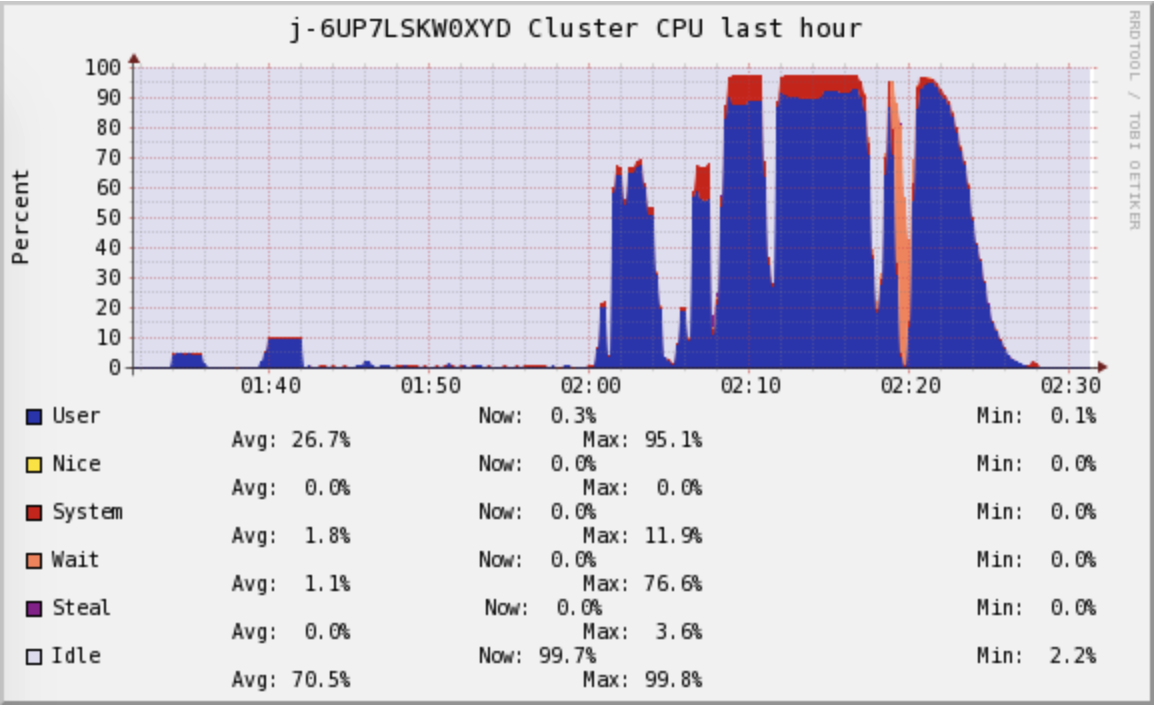 We monitored the core nodes more closely and tried to replicate the issue by running an equal number of Spark jobs to the total number of jobs processed by failed clusters. In our test,we monitored the core node directly, meaning we connected tothe node and monitored it with tools such as iostat and iotop.