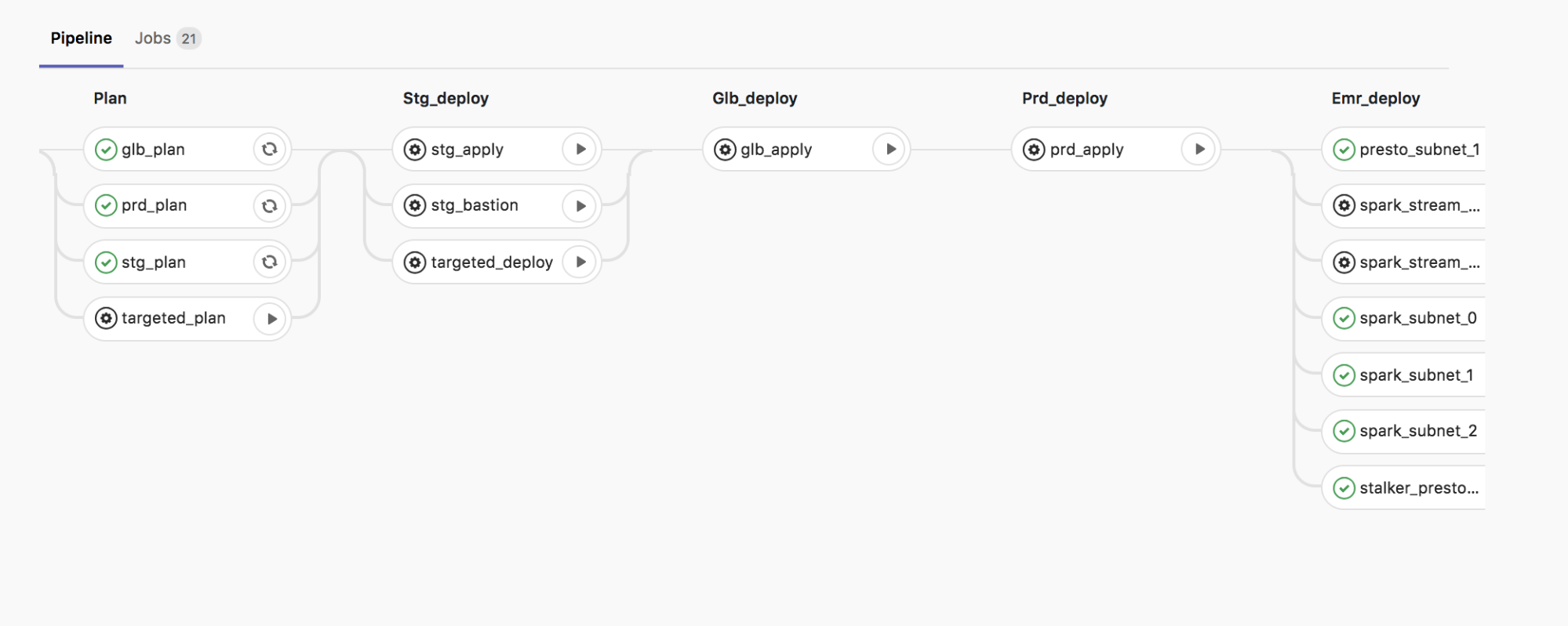 For deploymentsrequiringan upgrade of the EMR version or of internal libraries, we roll out the new version to a random availability zone. This lets us perform canary deployments of our core processing infrastructure. It also lets us rollback very quickly as the remaining availability zones suffice to execute the pipeline’s workload. To do this, we use terraform and our Gitlab CI.